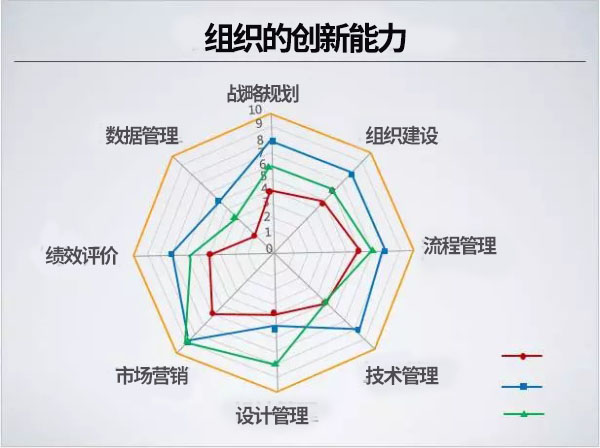 她結(jié)合組織創(chuàng)新能力的“雷達(dá)圖”介紹了目前行業(yè)內(nèi)三類典型的具有不同競爭力的企業(yè)及其對應(yīng)的組織創(chuàng)新能力:一類是具有規(guī)模技術(shù)成本優(yōu)勢的企業(yè),近年來以垂直整合產(chǎn)業(yè)鏈和全球產(chǎn)業(yè)布局為競爭戰(zhàn)略,在組織建設(shè)、流程管理和技術(shù)管理能力方面競爭優(yōu)勢明顯。但這類企業(yè)由于規(guī)模達(dá)到一定的程度,大量的訂單可能依托于國際市場,因此在設(shè)計(jì)管理方面相對有所欠缺(圖中藍(lán)線);第二類是進(jìn)入“十一五”以后大批涌現(xiàn)出的創(chuàng)新型企業(yè),這些企業(yè)有自己的戰(zhàn)略規(guī)劃,在精準(zhǔn)的細(xì)分領(lǐng)域不斷拓展,關(guān)注組織建設(shè)、流程建設(shè)和設(shè)計(jì)管理,擅長整合引進(jìn)技術(shù)來強(qiáng)調(diào)時(shí)尚在全球紡織界的競爭力(圖中綠線);第三類是需要培養(yǎng)更好優(yōu)勢才能夠重新穩(wěn)住自己市場的廣大“紅海”企業(yè)(圖中紅線)。其中,前兩類企業(yè)雖然有一定的組織創(chuàng)新能力,但是其最擅長的還是市場營銷,相比之下大數(shù)據(jù)管理均較為薄弱。