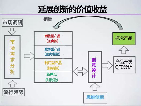 同時(shí),她強(qiáng)調(diào)企業(yè)應(yīng)該注重延展創(chuàng)新的價(jià)值收益,她說:“延展創(chuàng)新的價(jià)值收益至關(guān)重要。企業(yè)的產(chǎn)品由銷量型產(chǎn)品、競爭型產(chǎn)品、利潤型產(chǎn)品和按照流行趨勢開發(fā)的時(shí)尚新產(chǎn)品組成,企業(yè)所有產(chǎn)品在這四個(gè)緯度的分布決定了企業(yè)規(guī)模、利潤率及其最終商業(yè)收益。”