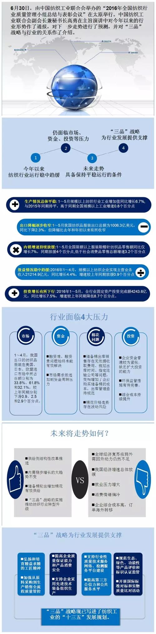 2016年不僅僅是“十三五”開局之年,也是我們行業(yè)按照國(guó)家的部署,進(jìn)一步提升質(zhì)量、增加品種和塑造品牌的重要一年。全行業(yè)要進(jìn)一步夯實(shí)質(zhì)量基礎(chǔ),提升行業(yè)整體質(zhì)量,推動(dòng)行業(yè)結(jié)構(gòu)性調(diào)整,促進(jìn)行業(yè)轉(zhuǎn)型升級(jí),塑造行業(yè)的品牌形象。我們要深刻領(lǐng)會(huì)黨的十八大以及十八屆五中全會(huì)的精神,在國(guó)家經(jīng)濟(jì)和行業(yè)發(fā)展“新常態(tài)”的大背景下,以“三品”戰(zhàn)略為綱領(lǐng),以“萬眾創(chuàng)新”為途徑,讓創(chuàng)新驅(qū)動(dòng)模式、質(zhì)量效益模式、品牌效益模式來推動(dòng)紡織行業(yè)穩(wěn)定、健康、高效、可持續(xù)發(fā)展,為實(shí)現(xiàn)紡織行業(yè)建設(shè)強(qiáng)國(guó)目標(biāo)做出不懈努力。
