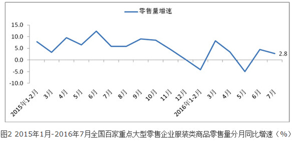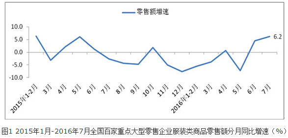 根據(jù)中華全國(guó)商業(yè)信息中心的統(tǒng)計(jì),2016年7月全國(guó)百家重點(diǎn)大型零售企業(yè)服裝類商品零售額同比增長(zhǎng)6.2%,增速較上月提高1.7個(gè)百分點(diǎn),較上年同期提高8.8個(gè)百分點(diǎn)。
