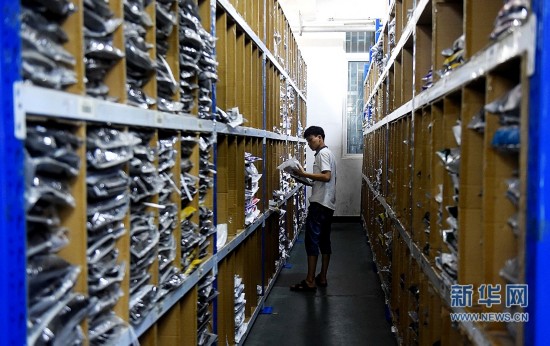 8月2日,鄭州一家服裝生產(chǎn)企業(yè)的工作人員在為線上訂單配貨。