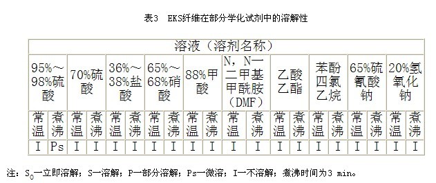 從圖1可以看出EKS纖維的縱向形態(tài)表面光滑,且有細(xì)微的條紋;從圖2可以看出,EKS纖維的橫裁面為圓形或近似圓形,跟絕大部份的化纖形態(tài)接近。 2.3溶解法 溶解法是利用纖維在不同溫度下的不同化學(xué)試劑中的溶解特性來鑒別纖維的方法。EKS纖維的溶解特性見表3。