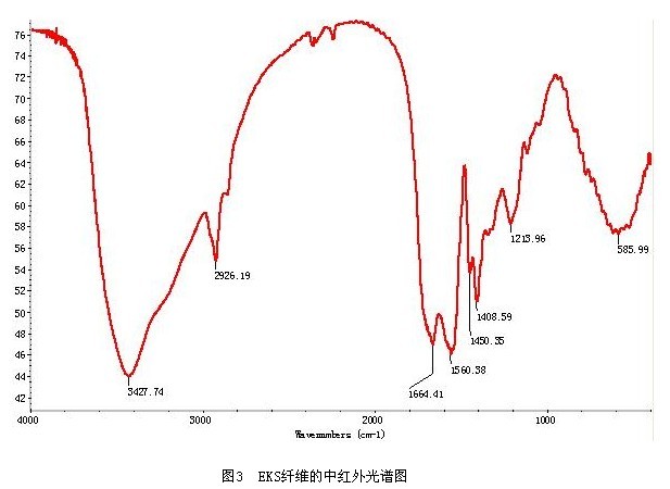 從表3可以看出EKS纖維即不溶解于強(qiáng)酸中,也不溶解于強(qiáng)堿中,在常用于纖維定性的有機(jī)溶劑中也無法溶解,說明EKS纖維結(jié)構(gòu)穩(wěn)定化學(xué)穩(wěn)定性也非常好。 2.4紅外光譜法 當(dāng)纖維分子中某個(gè)基團(tuán)的振動(dòng)頻率跟紅外光頻率一樣時(shí)分子就要吸收能量。紅外光譜圖就是通過吸收峰的位置,相對(duì)強(qiáng)度以及峰的形狀提供化合物的結(jié)構(gòu)信息。EKS纖維是由高分子材料組成,所以也適合用于紅外光譜法進(jìn)行定性分析。 測(cè)試條件和方法:掃描32次,分辨率4cm-1,光譜范圍400cm-1~4000cm-1,采用ITR附件,對(duì)光譜進(jìn)行自動(dòng)基線校正處理。測(cè)試時(shí),將織物拆成紗線置于晶體(硒化鋅ZnSe)材料上方,采用點(diǎn)對(duì)點(diǎn)采樣技術(shù),適當(dāng)旋緊ITR附件固定鈕,使纖維與晶體材料緊密接觸,紅外光束在晶體內(nèi)發(fā)生衰減全反射后,通過纖維的反射信號(hào)獲得其有機(jī)成分的結(jié)構(gòu)信息,用計(jì)算機(jī)軟件得到樣品的紅外吸收光譜圖(見圖3)。