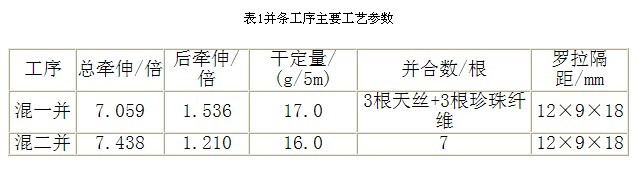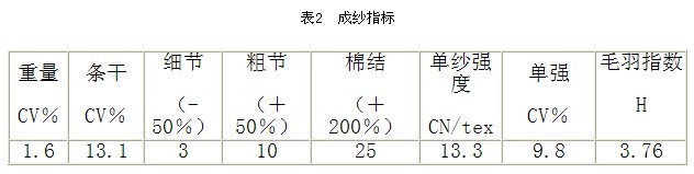 2.4粗紗工序 粗紗工序采用“大隔距、重加壓、大捻系數(shù)、小后區(qū)牽伸”的工藝原則。由于細(xì)紗采用雙根粗紗同時(shí)喂入,要滿足賽絡(luò)紡工藝的要求,所以粗紗定量應(yīng)較輕設(shè)置,要適當(dāng)放大隔距,調(diào)整好粗紗張力,減小前后排粗紗伸長(zhǎng)率差異,控制在2%以內(nèi)。粗紗工序主要工藝參數(shù)為:粗紗干定量3.5g/10m,羅拉隔距:10.5mm×25.5mm×35.5mm,捻系數(shù)78,后區(qū)牽伸倍數(shù)1.21倍,錠子速度710r/min。 2.5細(xì)紗工序技術(shù)措施 珍珠纖維與天絲混紡紗主要用于高檔針織服裝,因此對(duì)毛羽及強(qiáng)力的要求都很高。經(jīng)過(guò)試紡,賽絡(luò)紡紗工藝可以滿足客戶的要求。賽絡(luò)紡是兩根定量完全相同的粗紗同時(shí)喂入細(xì)紗牽伸區(qū),牽伸后的須條在前羅拉輸出后再合并、加捻,能有效減小加捻三角區(qū)寬度,所以對(duì)減少毛羽效果較好,同時(shí)成紗強(qiáng)力較高。通過(guò)采用單喇叭口的喂入工藝,并將平行紗條的間距由5mm縮小至4mm,使得紡紗時(shí)的牽伸、加捻效果最好且不易斷頭。 采用新型納米陶瓷合金鋼領(lǐng),納米合金鋼絲圈,并且比其它同支數(shù)普通環(huán)錠紡品種加重1號(hào)。主要工藝參數(shù):前羅拉速度201r/min,后區(qū)牽伸倍數(shù)1.25倍,羅拉中心距:43mm×63mm,捻系數(shù)340。 在實(shí)際紡紗過(guò)程中,應(yīng)加強(qiáng)運(yùn)轉(zhuǎn)操作管理。一方面要加強(qiáng)巡回防止出現(xiàn)單股現(xiàn)象,另一方面對(duì)于換接粗紗,要保證同錠的兩個(gè)粗紗同時(shí)換且是等長(zhǎng)的。[2]保全也要檢查好各專件,保證吊錠轉(zhuǎn)動(dòng)靈活,調(diào)節(jié)好內(nèi)外層導(dǎo)紗桿位置,保證粗紗順利退繞,縮短皮輥更換周期,優(yōu)選鋼領(lǐng)、鋼絲圈配置。 2.6絡(luò)筒 絡(luò)筒工序在電清參數(shù)的設(shè)置上做了大量?jī)?yōu)選試驗(yàn),確定在日本村田NO.21C型自絡(luò)上進(jìn)行生產(chǎn),它配備了先進(jìn)的瑞士USTER公司的QUANTUM2型電子清紗器,工藝參數(shù)設(shè)置為N:200%;S:150%,長(zhǎng)度:1.4cm;L:40%,長(zhǎng)度30cm;T:-40%,長(zhǎng)度25cm,CP+15%,Cm-15%,長(zhǎng)度2m;CCP+25%;CCm-20%,長(zhǎng)度1m;車速1200r/min。 2.7成紗指標(biāo) 經(jīng)過(guò)測(cè)試,珍珠纖維/天絲50/5014.7tex混紡賽絡(luò)針織紗指標(biāo)見下表: