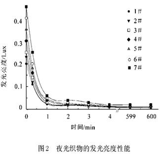 夜光纖維吸收可見(jiàn)光,10min其發(fā)光亮度隨時(shí)間的變化規(guī)律如圖2所示。圖2中絲束1~絲束7表示經(jīng)不同濃度的同一染料染色后的夜光絲束。這7種夜光絲束的染液濃度分別為:1%、0.5%、0.2%、0.1%、0.05%、0.02%、0(未染色)。