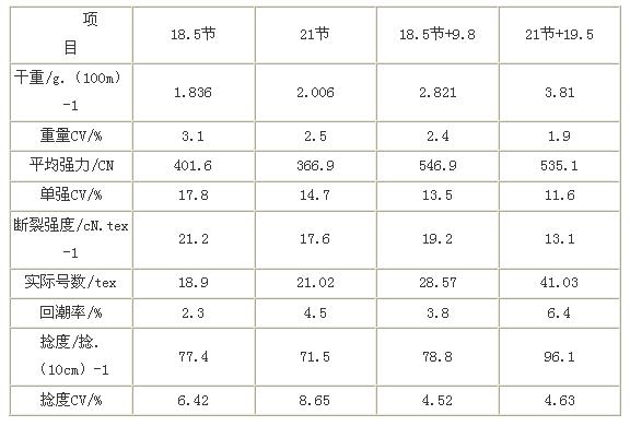 由于品種2紡細(xì)號竹節(jié)紗,這對粗紗條干要求較高,所以必須嚴(yán)格控制棉卷定量、梳棉棉網(wǎng)和棉粒、并條與粗紗條干等指標(biāo),在開清棉工序采用“多松少打、薄喂少落、防繞防粘”的工藝原則。另外,混色品種對混紡比要求較高,必須采用大方隊(duì)、多儲備、首尾搭配的方法。生產(chǎn)中還應(yīng)加強(qiáng)操作管理,防止鄰近機(jī)臺非本品種的飛花附入,合理選擇牽伸倍數(shù),嚴(yán)格控制竹節(jié)紗節(jié)距大小,控制好車間溫濕度,保證設(shè)備完好率,以確保紡紗質(zhì)量。