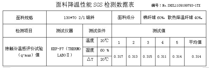 該面料降溫性能由日本SGS嚴格檢測,數(shù)據(jù)表明:以32*32130*702/1細斜為規(guī)格的面料由60%的棉纖維、40%散熱降溫纖維(36%錦綸材料、4%降溫材料)構成。在對其瞬間接觸涼感的多次試驗中,得到該面料瞬間涼感Q-MAX(W/cm2)值均遠遠高于國際上將面料定性為涼感型所要求≥0.14的數(shù)值要求。因此,“藍翔•賽爾膚”冰爽散熱防靜電安全防護工裝面料的冰爽散熱性能實至名歸。