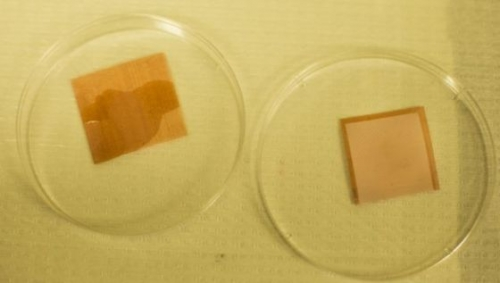 沒有涂層的瓷片(左)被液體浸濕了,而經(jīng)過處理的瓷片(右)仍是干的