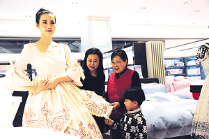 卡撒·珂芬(CasaCalvin)品牌為卡撒天驕集團旗下品牌,集團董事長鄭斯燦在發(fā)布會上表示,將雍容尊貴的古典風格融入到現(xiàn)代生活的時尚愜意中,為消費者營造一個時尚溫馨、優(yōu)雅經(jīng)典的臥室環(huán)境,這是卡撒·珂芬(CasaCalvin)一直追求的目標。圖為顧客在卡撒·珂芬直銷店近距離觀賞新型長絨棉家紡面料。