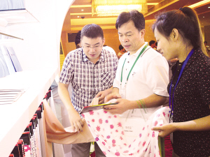 河北唐山三友集團興達化纖有限公司歷時6年創(chuàng)新自主研發(fā)的“竹代爾”新纖維源于竹,優(yōu)于棉,具有綠色環(huán)保、手感柔軟、抑菌滑爽、吸濕親膚、易染色牢等特性,現(xiàn)已在山東、廣東等省十余家下游企業(yè)成功試用,并獲得一致好評。圖為客戶在產(chǎn)品展示廳內(nèi)近距離感受“竹代爾”新纖維成品的性能。