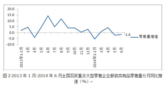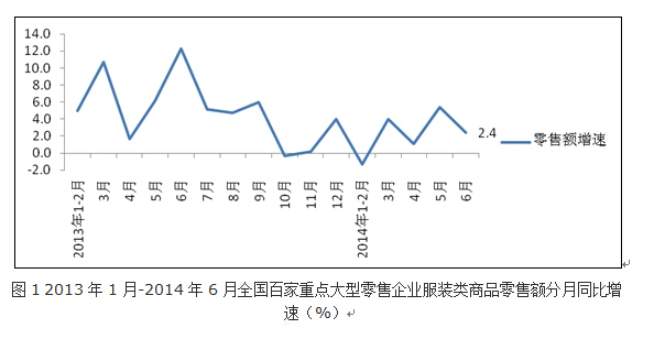 根據(jù)中華全國商業(yè)信息中心的統(tǒng)計,2014年1-6月全國百家重點大型零售企業(yè)服裝類商品零售額同比增長1.2%,增速上年同期下降5.7個百分點。其中6月份零售額同比增長2.4%,增速較上月放緩3個百分點,較上年同期低9.9個百分點。