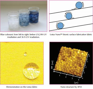 Lotus NanoTM納米仿生布能防止液體或固體的污物結聚在布面上,并能在清水的沖淋下,自行清潔表面的塵埃與固體的污物。一旦有液體或固體污物應壓力或密切接觸而附著在布面時,納米自清潔功能便開始發(fā)揮作用。