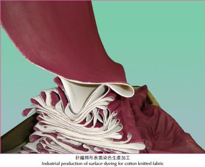 本研究發(fā)明了應用活性染料對棉針織布進行表面染色的技術(shù)。經(jīng)表面染色的針織布可以做具有牛仔服裝水洗效果的時裝。因只進行表面染色,染料及化學助劑的用量不到常規(guī)染色方法的一半,可顯著降低污染,綠色環(huán)保。