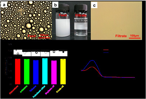 圖(a)和(c)分別為油水分離前后的光學(xué)顯微鏡圖,圖(b)為油水乳液和過(guò)濾液的光學(xué)照片,(d)為纖維素海綿的水下超疏油性,圖(e)為水乳液分離前后的紫外吸收?qǐng)D。