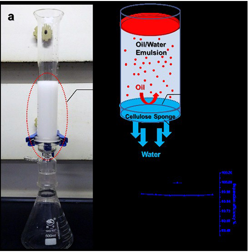 中國(guó)科學(xué)院寧波材料技術(shù)與工程研究所科研人員曾志翔、王剛、賀怡等通過(guò)纖維素的溶解再生及成孔劑占位的方法制備了表面納米孔、基體大孔的纖維素海綿用來(lái)分離表面活性劑穩(wěn)定的油水乳液。