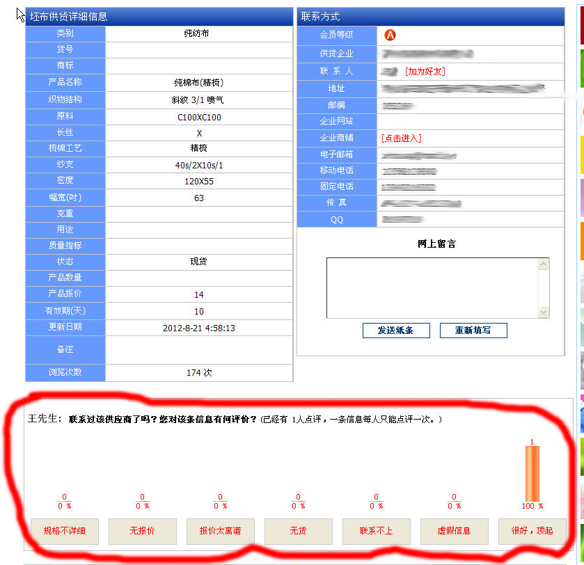 為提高信息準(zhǔn)確性,本網(wǎng)現(xiàn)已在每一條供應(yīng)信息后面增加了評(píng)價(jià)功能,用戶(hù)登陸后,就可對(duì)該條信息進(jìn)行評(píng)價(jià),每一用戶(hù)只能對(duì)每條信息評(píng)價(jià)一次。 如下圖: 2012年8月21日 轉(zhuǎn)載本網(wǎng)專(zhuān)稿請(qǐng)注明:"本文轉(zhuǎn)自錦橋紡織網(wǎng)" |