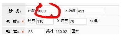 4、紗支、密度、幅寬的填寫方法:經(jīng)紗,因為只有長絲,填“100D”,緯紗填寫“45s”。