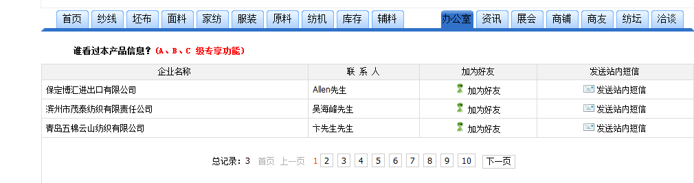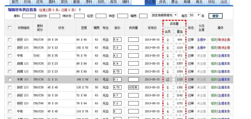 為有利于會(huì)員企業(yè)了解自己所發(fā)布產(chǎn)品信息的關(guān)注度,今日本網(wǎng)新增供貨信息點(diǎn)擊量統(tǒng)計(jì)功能,讓會(huì)員了解自己產(chǎn)品的市場(chǎng)關(guān)注度。 一是錦橋紡織網(wǎng)注冊(cè)用戶(hù)登陸后瀏覽該條信息,會(huì)將瀏覽者的企業(yè)名稱(chēng)、瀏覽者記錄下來(lái),便于信息發(fā)布者進(jìn)行聯(lián)系。