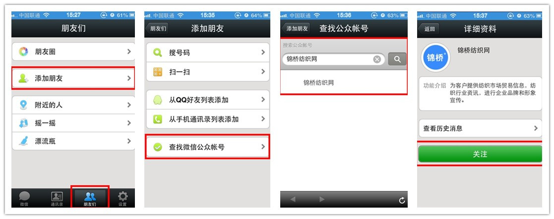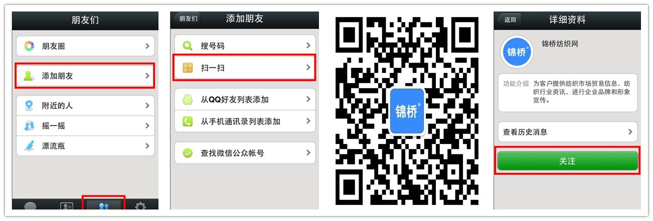 一、1.登陸您的微信;2.點(diǎn)擊朋友們——添加朋友;3.查找微信公眾帳號;4.輸入:錦橋紡織網(wǎng);5.點(diǎn)擊關(guān)注