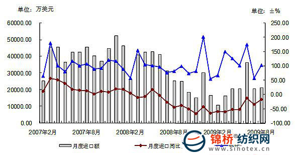 二、 紡織機(jī)械產(chǎn)品進(jìn)出口情況 據(jù)海關(guān)統(tǒng)計(jì),2009年1~8月我國(guó)紡織機(jī)械進(jìn)出口累計(jì)總額為23.75億美元,同比下降41.48%。其中:紡織機(jī)械出口7.57億美元,同比下降32.38%,最深降幅是1月(-47.78%)。紡織機(jī)械進(jìn)口16.19億美元,同比下降44.95%,最深降幅是1月(-64.37%)。紡織機(jī)械大幅持續(xù)雙降,但逆差正在逐步縮小,下圖反映了我國(guó)紡織機(jī)械進(jìn)出口月度及環(huán)比和貿(mào)易逆差的變化情況。