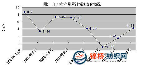 隨我國(guó)經(jīng)濟(jì)形勢(shì)逐漸好轉(zhuǎn),2009年1~8月,印染行業(yè)運(yùn)行延續(xù)了上半年以來(lái)的回升態(tài)勢(shì),生產(chǎn)增長(zhǎng)加快、效益狀況好轉(zhuǎn),2月份回升拐點(diǎn)更加明顯。但是出口尚未走出低谷,出口金額和單價(jià)降幅進(jìn)一步擴(kuò)大,形勢(shì)依然嚴(yán)峻。 一、經(jīng)濟(jì)運(yùn)行總體情況 (一)生產(chǎn)、銷售情況 1、生產(chǎn)情況 2009年1~8月份,規(guī)模以上印染企業(yè)2312家,同比增加242家。規(guī)模以上企業(yè)印染布產(chǎn)量333.44億米,同比增加4.28%,增速減緩2.79個(gè)百分點(diǎn)。