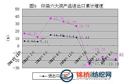 ?。ㄎ澹┻M出口貿(mào)易情況 1~8月份印染六大類產(chǎn)品進出口總額79.89億美元,同比減少19.19%;貿(mào)易順差46.21億美元,同比減少17.92%,增幅下滑50.58個百分點。