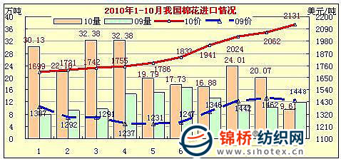 一是進(jìn)口棉價(jià)持續(xù)上漲,漲幅逐步加大。今年前10個(gè)月進(jìn)口棉價(jià)呈持續(xù)上揚(yáng)走勢(shì),下半年漲速明顯加快。1-10月進(jìn)口棉均價(jià)上漲432美元,漲幅25.4%,即由1699美元/噸上漲至10月份的2131美元/噸。其中上半年漲幅7.9%,6-10月漲幅16.3%。折人民幣由1月份的每噸11600元,上漲至6月份12520元和10月份的14330元/噸,10個(gè)月累計(jì)上漲2730元,其中上半年漲920元,下半年漲1810元。從進(jìn)口國(guó)別看,下半年來(lái),烏茲別克斯坦、澳大利亞、印度、美棉等漲幅較大,巴西棉漲幅平穩(wěn),10月份進(jìn)口巴西棉為1998美元/噸,環(huán)比下降4美元/噸。如下表:
