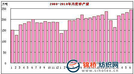 自2009年5月紗產(chǎn)量突破200萬噸水平以來,除今年1、2月份外,產(chǎn)量均保持在200萬噸以上水平。據(jù)國家統(tǒng)計(jì)局統(tǒng)計(jì),2010年6月份,全國規(guī)模以上紡織企業(yè)產(chǎn)紗243.98萬噸,創(chuàng)單月新高,同比增長10.2%,環(huán)比5月增長4.6%。2010年上半年累計(jì)產(chǎn)紗1269.69萬噸,同比增長17%,比2008年同期增長22.7%。2009/10年度(2009年9月-2010年6月),10個月累計(jì)產(chǎn)紗2156.74萬噸,折紡棉消費(fèi)約1030萬噸,同比增長16.7%。 另據(jù)統(tǒng)計(jì),6月份生產(chǎn)布58.18億米,同比增長12.9%。1-6月297.64億米,同比增長16.4%。紗線、布產(chǎn)量統(tǒng)計(jì)數(shù)據(jù)如下表:
