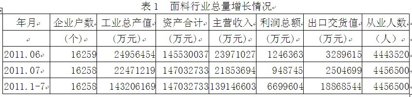 據(jù)國(guó)家統(tǒng)計(jì)局公布的數(shù)據(jù),2011年1-7月份我國(guó)規(guī)模以上面料行業(yè)企業(yè)數(shù)量為16258家,該行業(yè)實(shí)現(xiàn)工業(yè)總產(chǎn)值14321億元,同比增加29.54%;資產(chǎn)合計(jì)14703億元,同比增加18.09%;實(shí)現(xiàn)主營(yíng)收入13915億元,同比增加29.43%;完成利潤(rùn)總額669.96億元,比上年同期增加179.22億元,同比增加36.52%;完成出口交貨值1886.85億元,同比增加14.31%;行業(yè)整體從業(yè)人數(shù)445.65萬(wàn)人,同比增加5.78%。由此可見(jiàn),面料行業(yè)總量增長(zhǎng)勢(shì)頭良好,并為我國(guó)經(jīng)濟(jì)、財(cái)政、出口和就業(yè)作出了重大的貢獻(xiàn)。