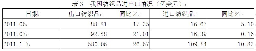 根據(jù)中國(guó)海關(guān)的統(tǒng)計(jì)數(shù)據(jù),我國(guó)2011年1-7月份紡織品出口總額580.06億美元,同比增加26.67%,占紡織品及服裝出口總額1411.22億美元的41.10%;1-7月份紡織品進(jìn)口總額109.84億美元,同比增加10.83%,占紡織品及服裝進(jìn)口總額130.22億美元的84.35%;顯示中國(guó)紡織品外貿(mào)形勢(shì)較好。