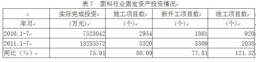 據(jù)國(guó)家統(tǒng)計(jì)局公布的數(shù)據(jù),2011年1-7月份面料行業(yè)實(shí)際完成投資額1323.36億元,同比增加75.91%;當(dāng)年以來(lái)到目前為止施工項(xiàng)目總數(shù)為5320個(gè),同比增加80.09%;其中新開(kāi)工項(xiàng)目數(shù)3309個(gè),同比增加77.81%;截至7月底為止,已實(shí)現(xiàn)竣工項(xiàng)目數(shù)2038個(gè),同比增加121.52%,占施工項(xiàng)目總數(shù)的38.31%,表明該行業(yè)投資項(xiàng)目進(jìn)展較好。