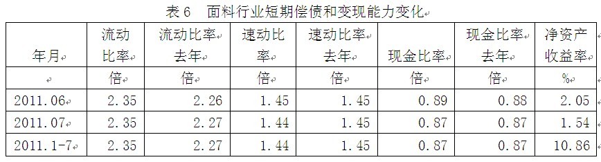從短期償債和變現(xiàn)能力的變化看,面料行業(yè)流動(dòng)比率(流動(dòng)資產(chǎn)/流動(dòng)負(fù)債)2011年1-7月份為2.35倍,而上年同期為2.27倍,流動(dòng)比率較高,表明企業(yè)短期償債能力較強(qiáng);