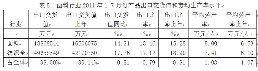 從行業(yè)產(chǎn)品出口交貨值和勞動(dòng)生產(chǎn)率水平看,2011年1-7月份面料行業(yè)產(chǎn)品出口交貨值為1886.85億元,占紡織全行業(yè)的38.00%;出口交貨值比上年同期增加14.31%;該行業(yè)產(chǎn)品出口比率(出口交貨值/工業(yè)銷(xiāo)售產(chǎn)值)為13.46%,而上年同期為15.28%,表明該行業(yè)產(chǎn)品出口狀況較好;從勞動(dòng)生產(chǎn)率的水平看,2011年1-7月份面料行業(yè)平均勞產(chǎn)率(工業(yè)增加值/從業(yè)人數(shù))為8.00萬(wàn)元/人,而上年同期為6.53萬(wàn)元/人,表明該行業(yè)勞動(dòng)生產(chǎn)率的實(shí)際水平較為理想。