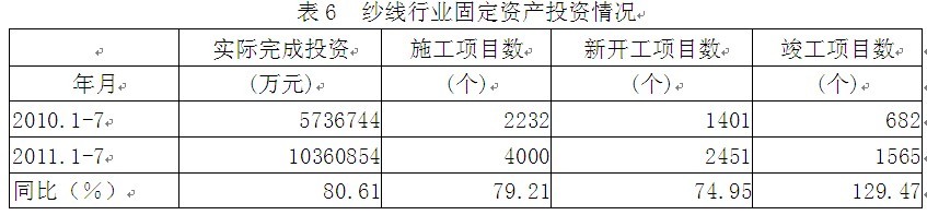 據(jù)國家統(tǒng)計局公布的數(shù)據(jù),2011年1-7月份紗線行業(yè)實際完成投資額1036.09億元,同比增加80.61%;當年以來到目前為止施工項目總數(shù)為4000個,同比增加79.21%;其中新開工項目數(shù)2451個,同比增加74.95%;截至7月底為止,已實現(xiàn)竣工項目數(shù)1565個,同比增加129.47%,占施工項目總數(shù)的39.13%,表明該行業(yè)投資項目進展較好。