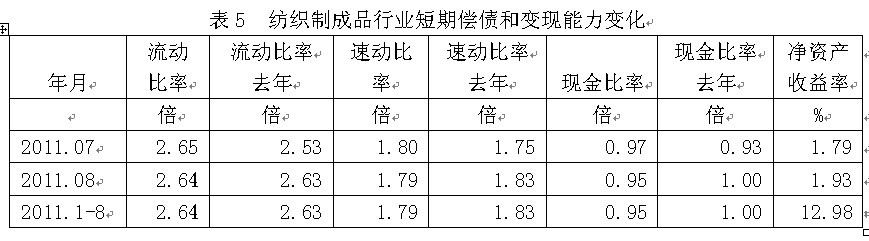 從短期償債和變現(xiàn)能力的變化看,紡織制成品行業(yè)流動比率(流動資產(chǎn)/流動負債)2011年1-8月份為2.64倍,而上年同期為2.63倍,流動比率較高,表明企業(yè)短期償債能力較強;