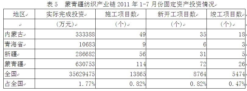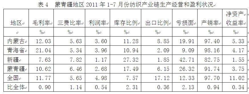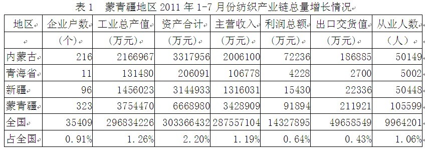 2011年1-7月蒙青疆紡織產(chǎn)業(yè)鏈經(jīng)濟運行分析