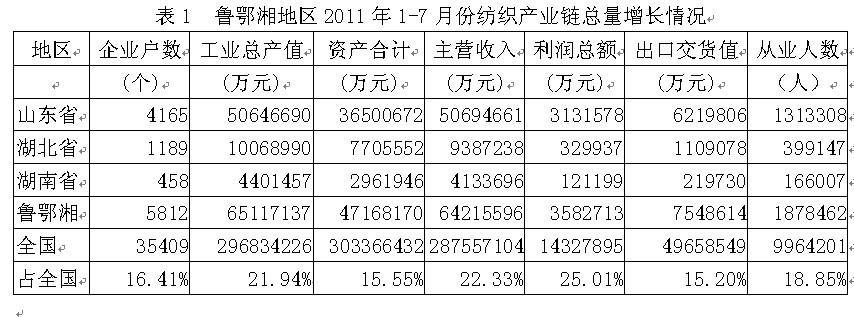 據(jù)國家統(tǒng)計局公布的數(shù)據(jù),2011年1-7月份我國魯鄂湘三?。ㄉ綎|省、湖北省、湖南?。┘徔棶a(chǎn)業(yè)鏈(從紡織上游原料到下游服裝)規(guī)模以上企業(yè)數(shù)量為5812家,占全國總數(shù)的16.41%;工業(yè)總產(chǎn)值為6511.71億元,占21.94%;資產(chǎn)合計為4716.82億元,占15.55%;主營收入為6421.56億元,占22.33%;利潤總額為358.27億元,占25.01%;出口交貨值為754.86億元,占15.20%;從業(yè)人數(shù)為187.85萬人,占18.85%。由此可見,魯鄂湘地區(qū)紡織產(chǎn)業(yè)鏈總產(chǎn)值、總資產(chǎn)、主營收入、利潤總額、出口和就業(yè)均給全國作出了巨大的貢獻。