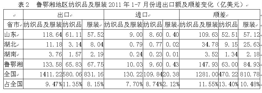 我國魯鄂湘三省2011年1-7月份紡織品及服裝出口額為133.58億美元,占全國紡織品服裝出口總額的9.47%,其中紡織品出口額為65.83億美元,占全國11.35%,服裝出口額為67.75億美元,占全國8.15%;在進口方面,魯鄂湘三省紡織品及服裝進口額為10.03億美元,占全國紡織品服裝進口總額的7.70%,其中紡織品進口額為9.60億美元,占全國8.74%,服裝進口額為0.43億美元,占全國2.12%;顯示我國魯鄂湘地區(qū)紡織品服裝出口總額遠高于進口總額,順差明顯,表明該地區(qū)紡織品服裝在國際市場上競爭力較強。