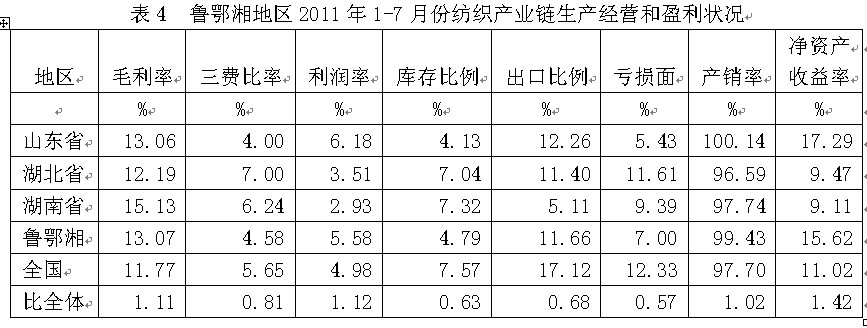 從生產(chǎn)經(jīng)營和盈利狀況看,魯鄂湘紡織產(chǎn)業(yè)鏈毛利率2011年1-7月份為13.07%,為全國平均數(shù)的1.11倍,三費比率(營業(yè)、管理和財務(wù)費用率之和)為4.58%,為全國平均數(shù)的0.81倍,利潤率為5.58%,為全國平均數(shù)的1.12倍;庫存比率為4.79%,為全國平均數(shù)的0.63倍;出口比例為11.66%,為全國平均數(shù)的0.68倍;企業(yè)虧損面為7.00%,為全國平均數(shù)的0.57倍。由此可見,魯鄂湘地區(qū)的盈利狀況接近于全國紡織產(chǎn)業(yè)鏈的平均水平。