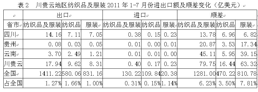 我國(guó)川貴云三省2011年1-7月份紡織品及服裝出口額為17.94億美元,占全國(guó)紡織品服裝出口總額的1.27%,其中紡織品出口額為9.62億美元,占全國(guó)1.66%,服裝出口額為8.31億美元,占全國(guó)1.00%;在進(jìn)口方面,川貴云三省紡織品及服裝進(jìn)口額為0.40億美元,占全國(guó)紡織品服裝進(jìn)口總額的0.31%,其中紡織品進(jìn)口額為0.17億美元,占全國(guó)0.15%,服裝進(jìn)口額為0.23億美元,占全國(guó)1.14%;顯示我國(guó)川貴云地區(qū)紡織品服裝出口總額遠(yuǎn)高于進(jìn)口總額,順差明顯,表明該地區(qū)紡織品服裝在國(guó)際市場(chǎng)上競(jìng)爭(zhēng)力較強(qiáng)。