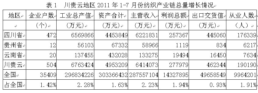據(jù)國(guó)家統(tǒng)計(jì)局公布的數(shù)據(jù),2011年1-7月份我國(guó)川貴云三省(四川省、貴州省、云南?。┘徔棶a(chǎn)業(yè)鏈(從紡織上游原料到下游服裝)規(guī)模以上企業(yè)數(shù)量為504家,占全國(guó)總數(shù)的1.42%;工業(yè)總產(chǎn)值為676.34億元,占2.28%;資產(chǎn)合計(jì)為495.32億元,占1.63%;主營(yíng)收入為641.41億元,占2.23%;利潤(rùn)總額為27.80億元,占1.94%;出口交貨值為46.23億元,占0.93%;從業(yè)人數(shù)為19.02萬(wàn)人,占1.91%。由此可見(jiàn),川貴云地區(qū)紡織產(chǎn)業(yè)鏈總產(chǎn)值、總資產(chǎn)、主營(yíng)收入、利潤(rùn)總額、出口和就業(yè)均給全國(guó)作出了一定的貢獻(xiàn)。
