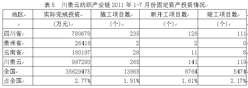 據(jù)國(guó)家統(tǒng)計(jì)局公布的數(shù)據(jù),2011年1-7月份川貴云地區(qū)紡織產(chǎn)業(yè)鏈實(shí)際完成投資額98.73億元,占全國(guó)實(shí)際投資總額的2.77%;當(dāng)年以來(lái)到目前為止施工項(xiàng)目總數(shù)為265個(gè),占全國(guó)施工總數(shù)的1.91%;其中新開(kāi)工項(xiàng)目數(shù)141個(gè),占全國(guó)新開(kāi)工項(xiàng)目總數(shù)的1.61%;截至7月底為止,已實(shí)現(xiàn)竣工項(xiàng)目數(shù)119個(gè),占全國(guó)已竣工項(xiàng)目總數(shù)的2.17%,占該地區(qū)施工項(xiàng)目總數(shù)的44.91%,表明該地區(qū)投資項(xiàng)目進(jìn)展較好。