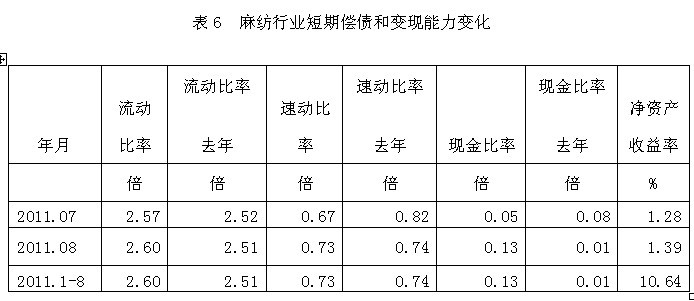 從短期償債和變現(xiàn)能力的變化看,麻紡行業(yè)流動比率(流動資產(chǎn)/流動負債)2011年1-8月份為2.60倍,而上年同期為2.51倍,流動比率較高,表明企業(yè)短期償債能力較強;