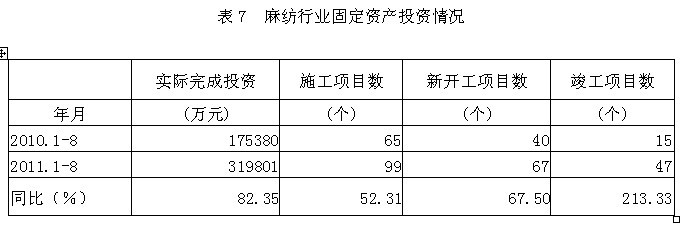 據(jù)國家統(tǒng)計局公布的數(shù)據(jù),2011年1-8月份麻紡行業(yè)實際完成投資額31.98億元,同比增加82.35%;當(dāng)年以來到目前為止施工項目總數(shù)為99個,同比增加52.31%;其中新開工項目數(shù)67個,同比增加67.50%;截至8月底為止,已實現(xiàn)竣工項目數(shù)47個,同比增加213.33%,占施工項目總數(shù)的47.47%,表明該行業(yè)投資項目進展較好。