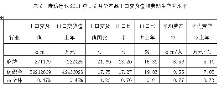從行業(yè)產(chǎn)品出口交貨值和勞動生產(chǎn)率水平看,2011年1-8月份麻紡行業(yè)產(chǎn)品出口交貨值為27.11億元,占紡織全行業(yè)的0.47%;出口交貨值比上年同期增加21.89%;該行業(yè)產(chǎn)品出口比率(出口交貨值/工業(yè)銷售產(chǎn)值)為13.20%,而上年同期為15.39%,表明該行業(yè)產(chǎn)品出口狀況較好;從勞動生產(chǎn)率的水平看,2011年1-8月份麻紡行業(yè)平均勞產(chǎn)率(工業(yè)增加值/從業(yè)人數(shù))為6.58萬元/人,而上年同期為5.10萬元/人,表明該行業(yè)勞動生產(chǎn)率的實際水平較為理想。