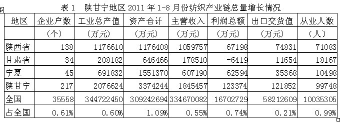據(jù)國家統(tǒng)計局公布的數(shù)據(jù),2011年1-8月份我國陜甘寧三省(陜西省、甘肅省、寧夏)紡織產(chǎn)業(yè)鏈(從紡織上游原料到下游服裝)規(guī)模以上企業(yè)數(shù)量為217家,占全國總數(shù)的0.61%;工業(yè)總產(chǎn)值為207.66億元,占0.60%;資產(chǎn)合計為337.42億元,占1.09%;主營收入為184.55億元,占0.55%;利潤總額為12.34億元,占0.74%;出口交貨值為12.19億元,占0.21%;從業(yè)人數(shù)為9.97萬人,占0.99%。由此可見,陜甘寧地區(qū)紡織產(chǎn)業(yè)鏈總產(chǎn)值、總資產(chǎn)、主營收入、出口和就業(yè)均給全國作出了一定的貢獻(xiàn)。
