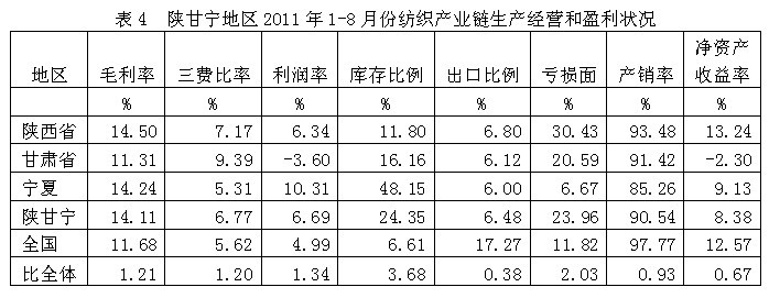 從生產(chǎn)經(jīng)營和盈利狀況看,陜甘寧紡織產(chǎn)業(yè)鏈毛利率2011年1-8月份為14.11%,為全國平均數(shù)的1.21倍,三費(fèi)比率(營業(yè)、管理和財務(wù)費(fèi)用率之和)為6.77%,為全國平均數(shù)的1.20倍,利潤率為6.69%,為全國平均數(shù)的1.34倍;庫存比率為24.35%,為全國平均數(shù)的3.68倍;出口比例為6.48%,為全國平均數(shù)的0.38倍;企業(yè)虧損面為23.96%,為全國平均數(shù)的2.03倍。由此可見,陜甘寧地區(qū)的盈利狀況接近于全國紡織產(chǎn)業(yè)鏈的平均水平。