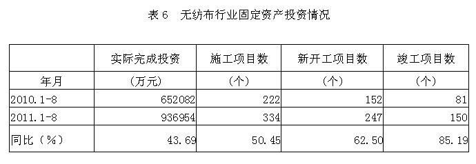 據(jù)國(guó)家統(tǒng)計(jì)局公布的數(shù)據(jù),2011年1-8月份無(wú)紡布行業(yè)實(shí)際完成投資額93.70億元,同比增加43.69%;當(dāng)年以來(lái)到目前為止施工項(xiàng)目總數(shù)為334個(gè),同比增加50.45%;其中新開(kāi)工項(xiàng)目數(shù)247個(gè),同比增加62.50%;截至8月底為止,已實(shí)現(xiàn)竣工項(xiàng)目數(shù)150個(gè),同比增加85.19%,占施工項(xiàng)目總數(shù)的44.91%,表明該行業(yè)投資項(xiàng)目進(jìn)展較好。