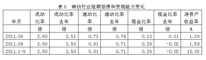 從產(chǎn)銷銜接情況看,2011年1-9月份麻紡行業(yè)產(chǎn)銷率為97.00%,表明該行業(yè)產(chǎn)品銷售狀況較好;應(yīng)收賬款周轉(zhuǎn)率(主營收入/應(yīng)收賬款凈額)為14.24次;應(yīng)收賬款運(yùn)轉(zhuǎn)周期(270天/應(yīng)收賬款周轉(zhuǎn)率)為18.96天,應(yīng)收賬款周轉(zhuǎn)次數(shù)越多,或者應(yīng)收賬款周轉(zhuǎn)天數(shù)越少,表明其實(shí)現(xiàn)利潤的通道越加通暢。