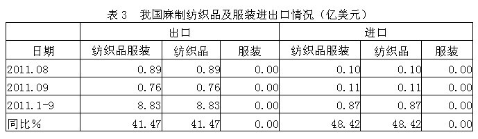 在進(jìn)口方面,我國2011年1-9月份麻制紡織品及服裝進(jìn)口總額0.87億美元,同比增加48.42%,占紡織品及服裝進(jìn)口總額171.53億美元的0.51%;其中1-9月份麻制紡織品進(jìn)口總額0.87億美元,同比增加48.42%,占紡織品進(jìn)口總額142.13億美元的0.61%;顯示中國麻制紡織品和服裝外貿(mào)形勢較好。